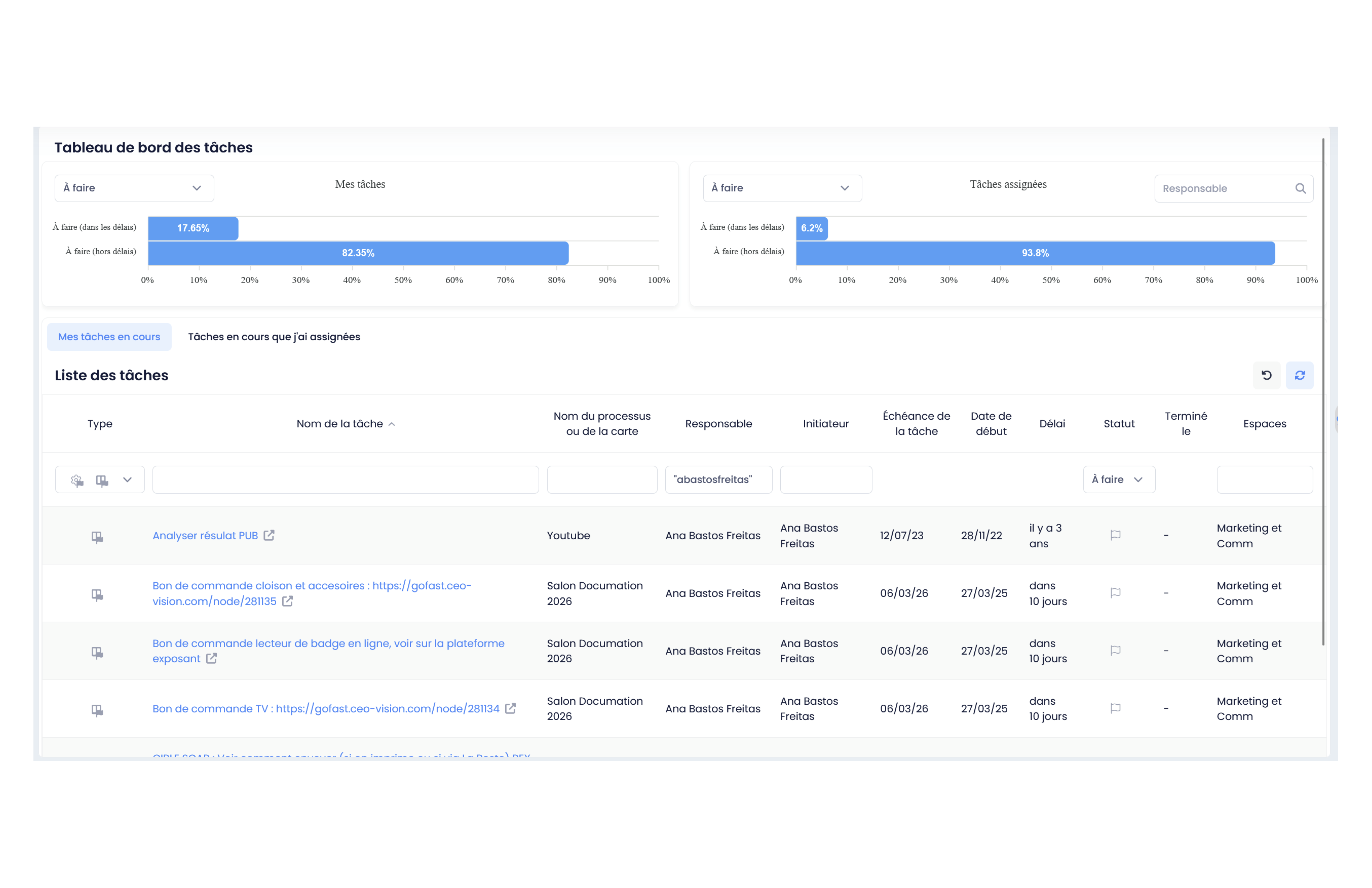 L’accès aux cartes Kanban GoFAST est également possible depuis le tableau de bord des tâches, un espace qui offre une vue complète de toutes les missions en cours et attribuées.