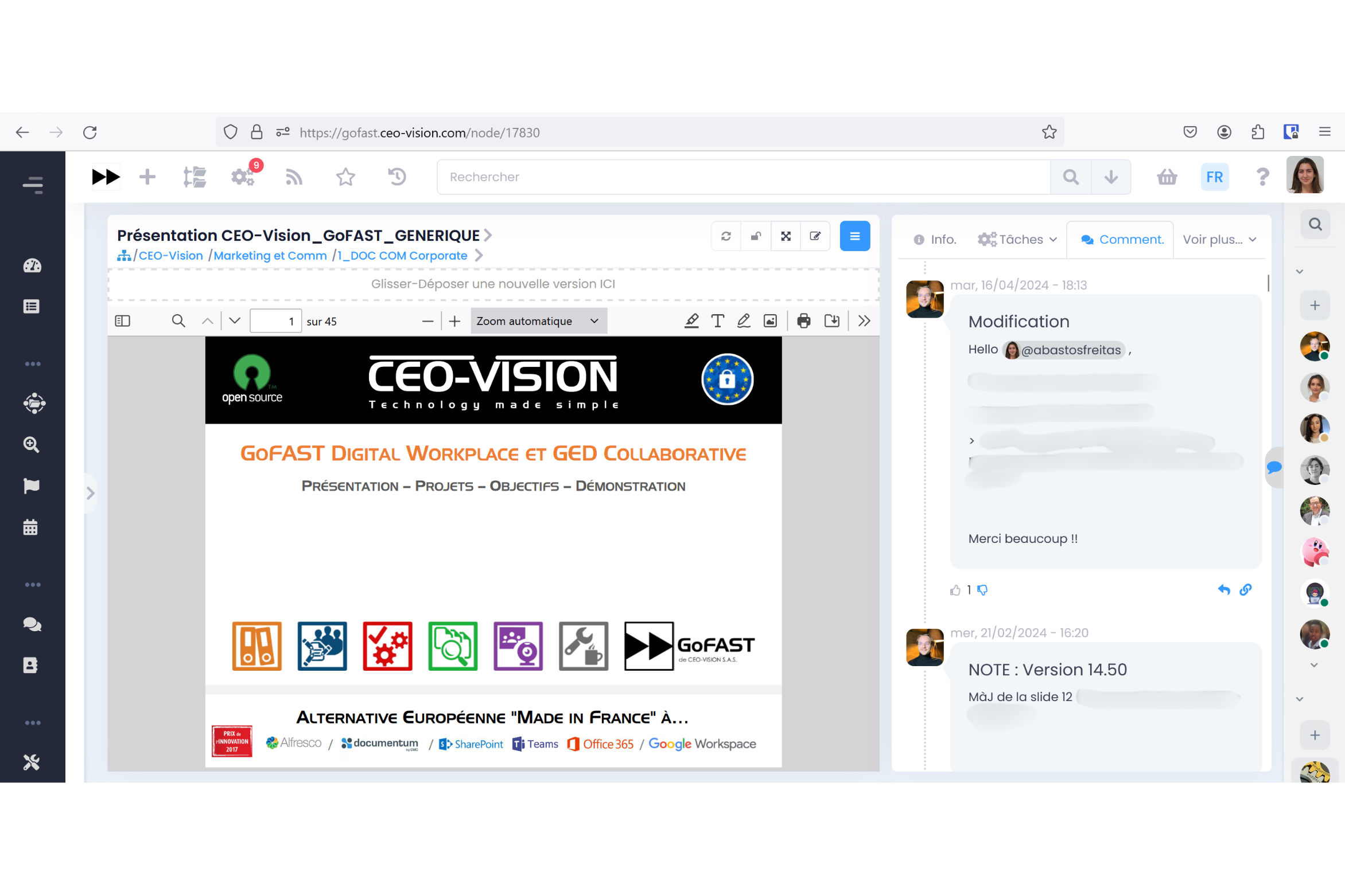 Qu'il s'agisse de coédition, de partage, de processus métiers, des commentaires, du Chat, des réunions... Le concept "document-centric" de GoFAST permet de centraliser la gestion des documents, de leur création depuis un modèle à la e-signature et le pré-archivage, avec : zéro pièce-jointe, zéro doublon, zéro erreur de version, zéro tâche oubliée et zéro perte d'informations.